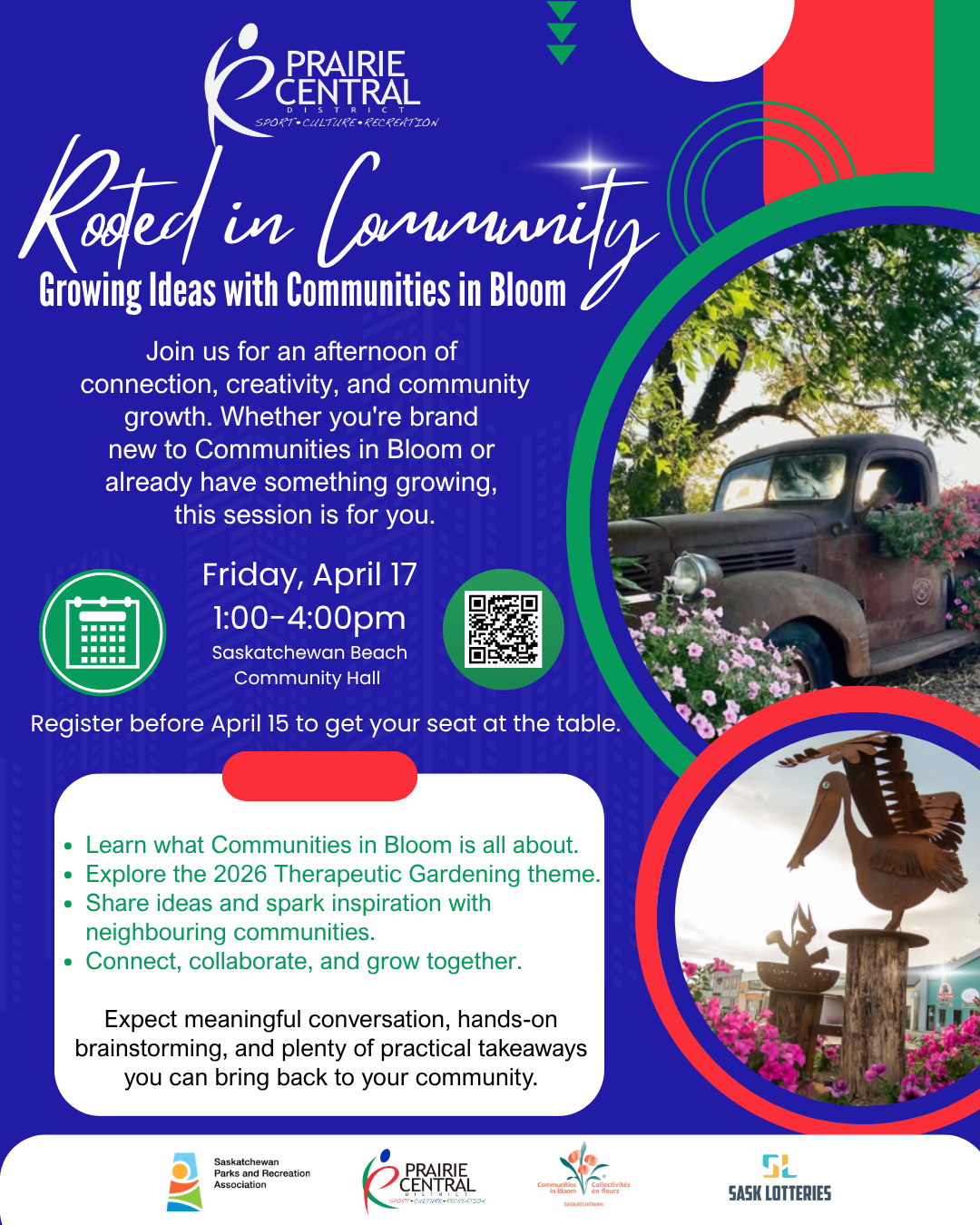 Spend the afternoon with PCD, SPRA and your neighbours connecting, sharing ideas, and growing together. Whether you’re just getting started with Communities in Bloom or already nurturing projects in your community, this session offers something for everyone.